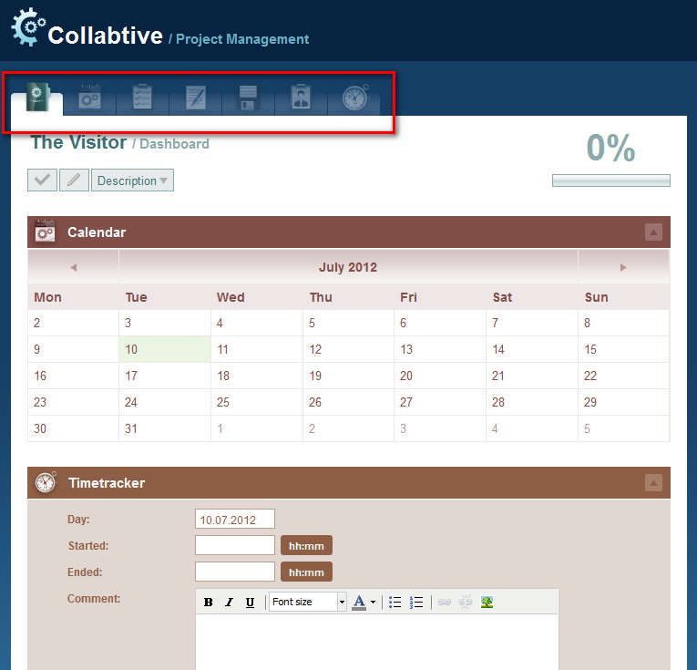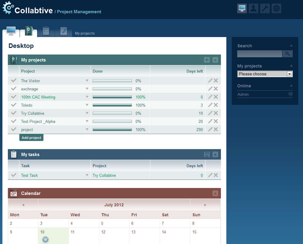 Another far more easier way to describe groupware software would be the following two words, project management, it’s basically the same thing. The principles are the same, people working together on projects. Image above is the default interface of the Collabtive project management system where you can see some of the useful features that you get with it. Desktop is the default location where you have overview of currently active projects, tasks that you need to do and also a calendar with your responsibilities marked on it.