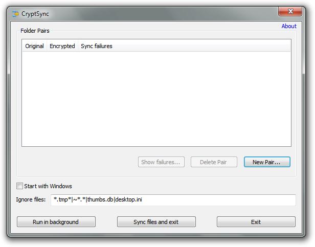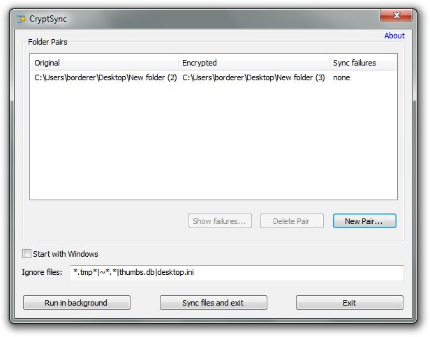 Screenshot above shows us the main user interface of CryptSync. First from the top, there is the window where all your paired folders will be shown. Under that window you have three buttons; Show Failures, Delete Pair, New Pair. Under all of that you can choose do you want to start the CryptSync with windows and you can choose which files CryptSync will ignore when encrypting. At the bottom of the CryptSync free application you have another three buttons; Run in Background (minimizes it), Sync Files and Exit (for starting the encryption) and Exit.
