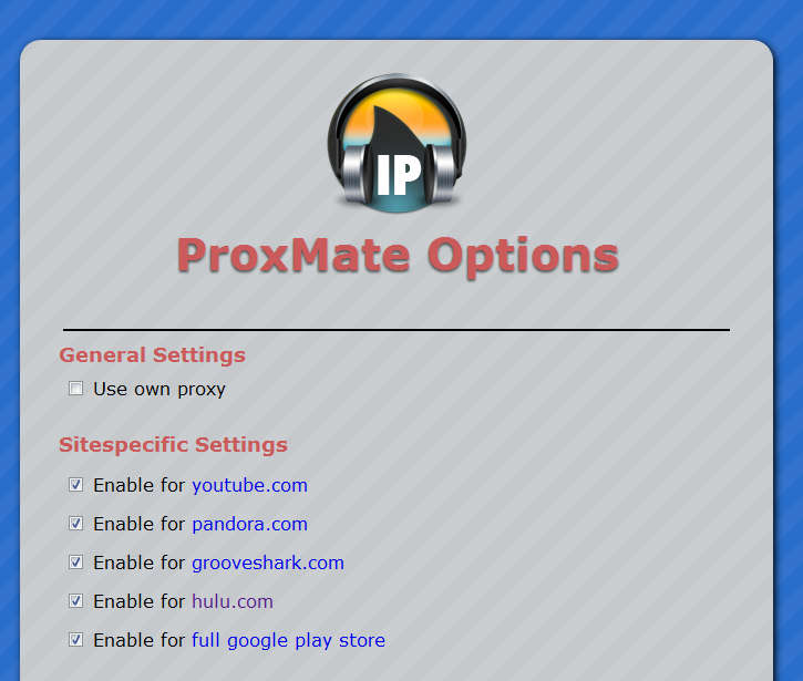 As you might have picked it up from the name of this free extension, ProxMate is basically a proxy manager. It comes with its own list of proxies, or as you can see from the image above you can also use your own proxies. Image above is a screenshot of ProxMate settings where you can see a list of supported services. 5 different websites can be unblocked and accessed with ProxMate: