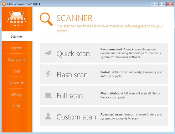 Even though 9-Lab offers a lot of the same functionality that you find in antivirus applications, it’s technically speaking not an antivirus software. Malwarebytes Anti-Malware would be much closer to 9-Lab Removal Tool when it comes to what it does. Left sidebar is used for navigation, while the right side of the interface shows whatever option you select. In our case that would be the Scanner. You can see the four scan methods that we mentioned listed there.