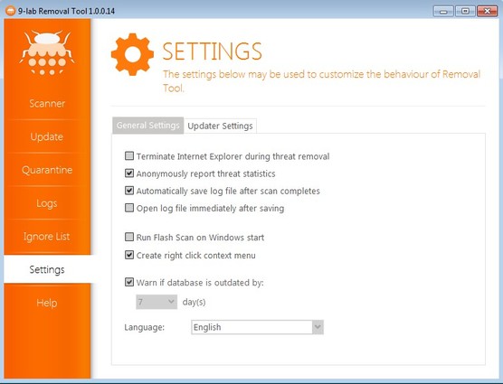 Before scanning, make sure you’ve first fully updated this free malware removal utility by selecting the Update tab from the left sidebar. Settings allow you to tweak some very important settings like for example log saving, anonymous updates (via proxy) and several more. Folders that you don’t want scanned should be added to the Ignore List. To check back on previous scans, select Logs from the left sidebar and open up the log that you need from there.