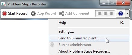 To mail the zip file directly from within the Problem Steps Recorder, click on the drop arrow present at the extreme right and choose Send to E-mail recipient option, once the recording is saved.