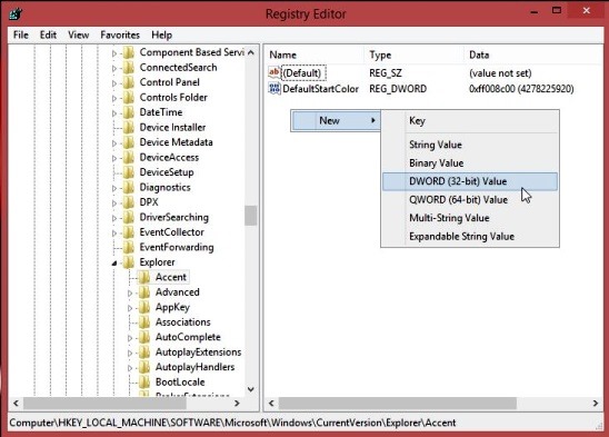 - Open this Accent key, by selecting it from the list of keys in the left part of Registry Editor. And add a new DWORD (32-bit) Value.
