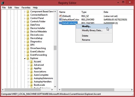 4. Once you have the DefaultColorSet DWORD (32-bit) Value selected on right part of Registry Editor, simply right-click on it and select Modify.