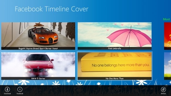 Now similarly apps like Facebook timeline cover have been released in Windows 8 that enable you to select and change your cover image from a list of cool looking cover pictures that are constantly being updated. ![]()