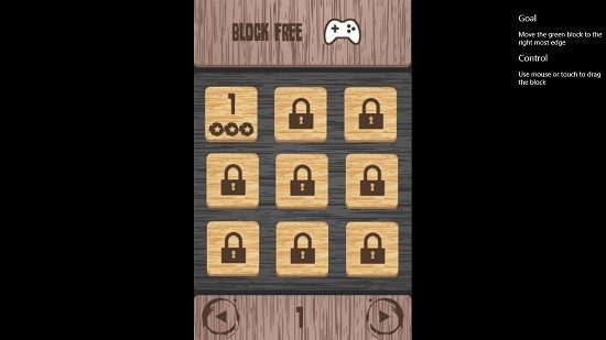When you install and run the Block Free game on your Windows 8 or 8.1 device, you will be presented with the main screen of the app where basically you will be able to see the main controls of the game. You can shift the Green block to the right side of the screen to get to the level selection screen in the main screen of the game. The main screen of the game is shown below.
