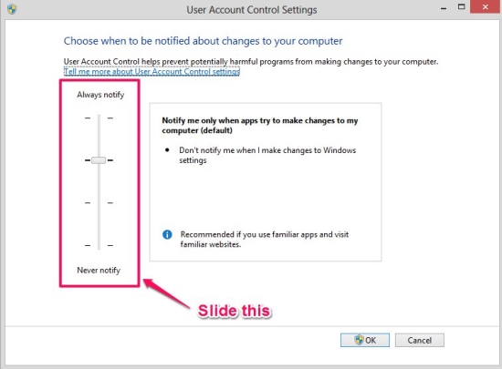 In this manner you can change the UAC setting in Windows 8 and manage the level of security (Annoyance) in Windows 8.