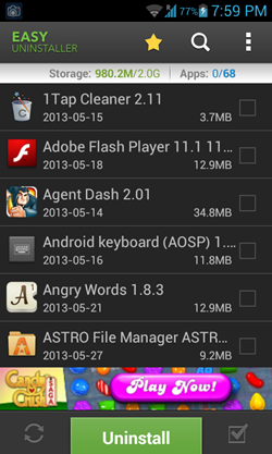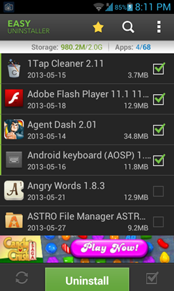 To uninstall an application, simply tap on an application, and a tick mark will appear in the check box next to the app. When you select some applications, your screen should look like the following screenshot.