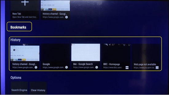 7. As you go on browsing websites, their thumbnails will appear in the History section on the main screen. similarly, any website that you bookmark will be visible in the Bookmarks section on the main screen.