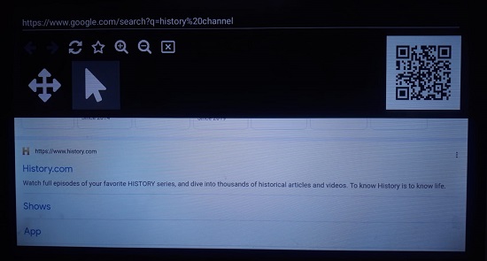 5. The toolbar below the Address panel contains the icons for Go back, Go forward, Page refresh, Bookmark present page, Zoom in, Zoom out and Page close respectively that you tap and select using the remote control. A QR Code of the website being displayed is automatically generated and made available on the screen.