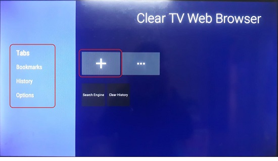 3. Use the Remote Control to move the selection to the ‘+’ sign on the main screen and tap it. This brings up the browser screen where you must type the URL of the website or the keywords to be searched and tap Enter. Clear TV Web browser use Google as the default search engine. This can be changed using the ‘Search Engine’ setting on the main screen.
