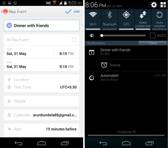 To add a new event, simply tap on the ‘+’ button in the main interface and you will have the option to add an new event as seen below. Once done with the details simply tap on the ‘Add’ button and the event will be added to your calendar. Sunrise Calendar for Android provides you with notification of the event as seen below.