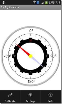Analog Compass is another free offline compass app for Android, that comes with realistic type of analog compass. It lets you customize the motion of the needle and at the same time lets you enable or disable calibration. It offers you two compass skin types, that you can choose according to your requirement. Not only that, it lets you customize the color of the needle, just in case, you wish to modify the view of the compass.