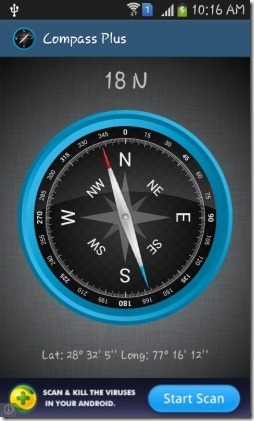 Compass Plus is a free offline compass for Android, that comes with customizable graphical features. This compass app has the ability to display latitude and longitude coordinates for the current location, if GPS is on. It offers many display settings, compass settings, and system settings. You can configure the background of the compass, compass needle type, housing color of the needle, and a lot more, to personalize the compass according to your needs. It also lets you enable calibration, which will give you accurate results. The app gives you option to run the compass in full screen mode, as well as keep the screen on when compass is running.