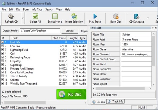 On the image above you can see FreeRIP in action. Left sidebar holds a list of songs from the audio CD, which is automatically recognized. Song title and artist information is also automatically fetched from online CD databases and appropriate ID3 tag info is filled out. You just need to look for cover images. On the right you have an editor for manually editing MP3 tag info. Song playback is possible using a built-in player.
