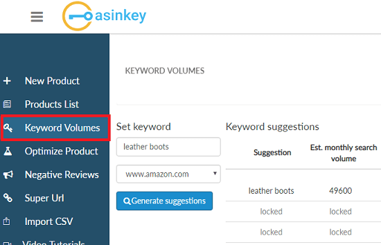 AsinKey is the last free tool in my list that you can use for Amazon keyword research. In the free plan, it only lets you get keyword data for a single keyword only. Also, the keyword suggestions are not included in the free plan. Here you can enter a keyword, specify a location, and get the monthly search volume. To get the monthly search volume of multiple keywords, you will have to manually search them one after another. Apart from one keyword suggestion, here it also offers some other features as well. You can use this website to add one product and track one keyword as well.