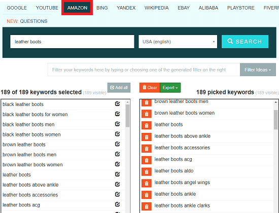 Keyword.io after creating a free account lets you search for the keyword ideas for Amazon. There is a separate section in it that you can use to get keyword ideas. However, here it can only generate a keywords list after taking a principal keyword from you. You can analyze the keywords list that it generates for you. And you can choose the desired keyword from that and save it in another list which you can export. You can export all the keywords or the selected ones into a text file.