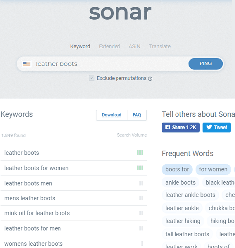 Sonar is quite a powerful keyword tool for Amazon that you can use. You can use this tool to generate the keyword suggestions after entering a main keyword. You can opt to get the keyword data from multiple locations and export that if you wish. The tool is simple and you can use it without creating an account. You can see the list of keywords that it generates along with the search volume density. You cannot see the exact number of search volume here. You can download the list of keywords in a CSV file.