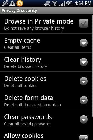 Skyfire Web Browser is a free Android browser which allows you to browse internet with advanced options. Skyfire Web Browser also provides private browsing on Android. You can easily clear cache, enable/disable save form data, enable/disable remember password option, clear all passwords, clear browsing history, clear cookies, and clear location access. For private browsing options, just tap on the arrow button the toolbar→settings→privacy & security→options. Apart from private browsing, it has multiple features. You can check the complete review on Skyfire browser for Android.