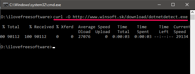 Curl is a cross-platform and a free software to download files from command line in Windows. Basically, it is a data transferring software which is also a backbone of thousands of applications and software. It supports a lot of protocols including HTTP, HTTPS, FTP, POP3, SMTP, IMAP, SCP and lot more, to transfer data in and out of a device. It is widely used in set top boxes, TV, Routers, Smartphone and in many devices to transfer data. Its binaries are also available for Windows operating system that you can use to easily upload and download files. And while downloading files, you can see various stats such as download speed, upload speed, average speed, time left, time spent, etc.