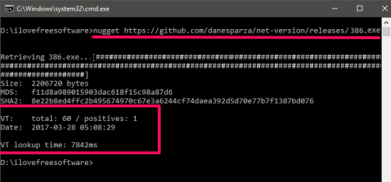 Nugget is a free software specially for Windows to download files. The software can be used via Windows command prompt, but that’s not necessary. It also comes with its own command line interface in which you can copy paste a download link of a file. The best thing about Nugget is that after downloading compressed files or executables, it performs a VirusTotal lookup for those files. So, it also shows the VirusTotal look up stats for the downloaded file along with SHA1 and MD5 hash.