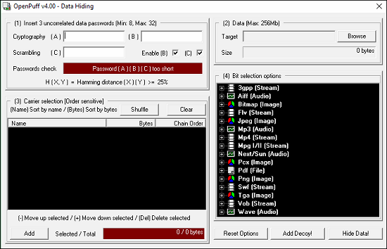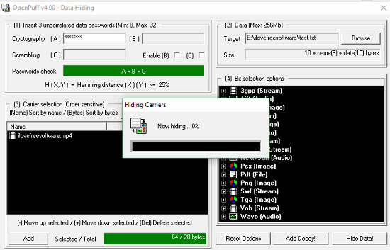 OpenPuff also includes some popular encryption techniques to encrypt your secret file in a video. It offers 256+256 bit symmetric key, 256 bit symmetric key data scrambling, and 256 bit symmetric key data whitening like encryption techniques.