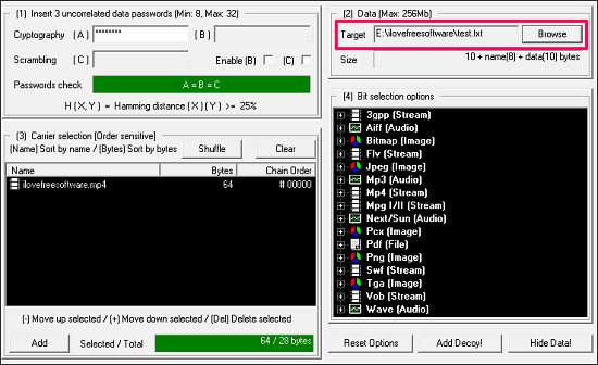 I have already mentioned that you can use drag and drop methods to input your carrier and secret file to its interface. So it’s pretty easy to use this freeware. You can see the following screenshot.