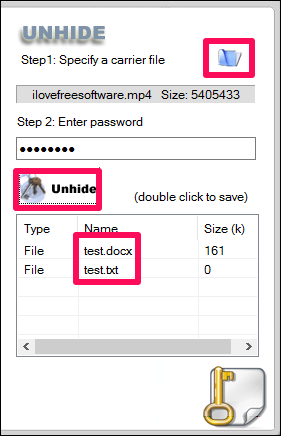 To unhide an existing carrier file that contains your messages or document, simply use Unhide section of the software. You just have to provide the source carrier file, password that you set during hiding process, and then hit Unhide button. You will see that all the files that were present in the carrier file will appear in the list box.