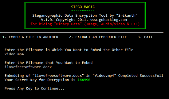 Step 2: Press 1 to embed a file. I will use a MS Word file(ilovefreesoftware.docx) as my secret and a video file (Video.mp4) as a carrier file and I have copied both these files are in StegoMagic’s directory for convenience.