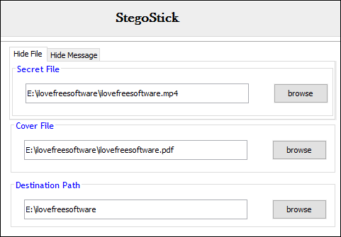 StegoStick is another powerful video Steganography software to hide messages and documents. It has very polished user interface. It does what it promises and the best thing about this freeware is that it provides 4 different encryption techniques to embed your secret file in carrier file. The encryption techniques that it has are: DES, Triple DES, RSA, and default. If you encrypt your secret file with RSA encryption, then it is nearly impossible to decrypt it without the actual key.