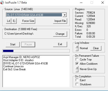 Great thing about IsoPuzzle is that its portable. Note that you’ll also have to download ASPI.dll from the download link down below and put it into the same folder where IsoPuzzle executable is in order for it to work. To setup recovery use the top left corner to choose source drive and the destination folder where disc image is going to be saved. Right sidebar has the progress report and lets you tweak recovery options (number of retries before giving up). Recovery log is available in the bottom left corner.