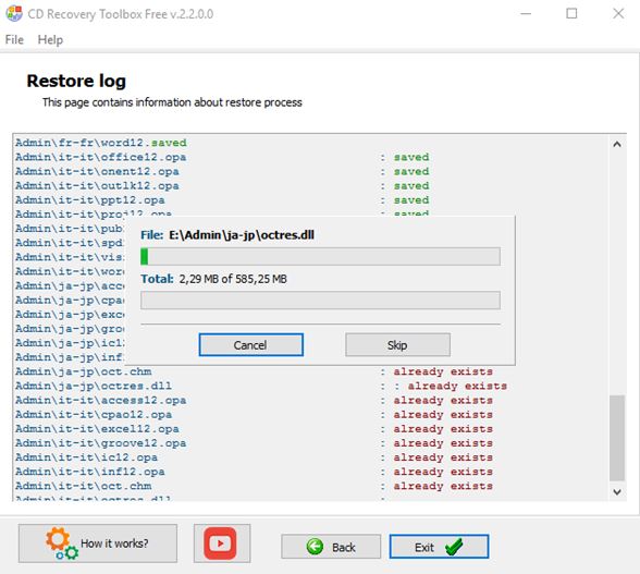 Setting up data recovery is pretty straightforward. Wizard will guide you through the selection of the optical drive, the output directory where restored files are going to be saved and so on. Once that everything is setup, you will see the status window pictured on the image above. Software is going to report back successfully recovered files and notify you about files that couldn’t be saved (they will be skipped during the recovery process).