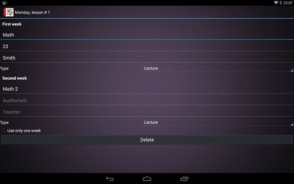 First thing you’re going to see after running the app is a week plan, where entries can be added. Tap on a day to setup your schedule.