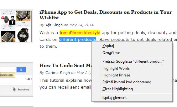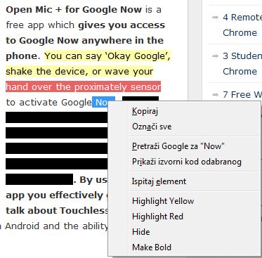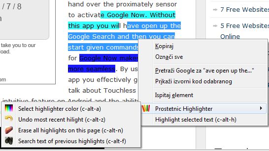 Like with all the addons until now the highlighting options are hidden away in the right click context menu. Controls for managing highlights are also added to the top right corner toolbar. On top of all that there are keyboard shortcuts that you can use. For example C + ALT + H will highlight selected text while C + ALT + N removes all highlights. Interesting feature of Prostetnic Highlighter is that it will keep highlights even after you refresh the page that you’re currently on.