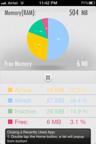 System UTIL Dashboard is a free iPhone app to give you useful information such as memory usage, processes running, disk space available, network info, etc. This iPhone app has a tiled interface, with each tile representing process. When you click on these tiles you will get a more detailed view of the information you are looking for.