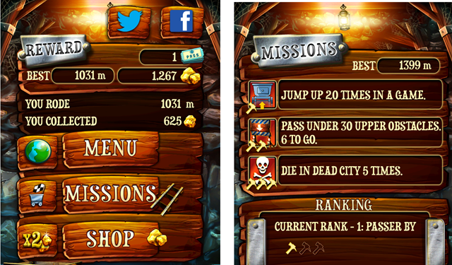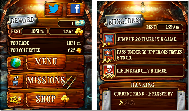 Rail Rush is a free iPhone running game in which you have to collect the gold nuggets while riding a cart. The cart is running on rail tracks which is full of obstacles. You need to avoid the obstacles and collect all the rewards and other things which come in your way. You can also complete missions and daily challenges. The game lets you check your rank on World Leaderboard via Game Center and also share the score via Facebook and Twitter.