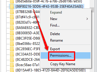 Step 4: Right-click on {86F80216-5DD6-4F43-953B-35EF40A35AEE} key and select Permissions.. option.
