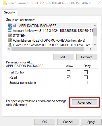 Step 5: Permissions window for that key will open. In that window, click Advanced button.