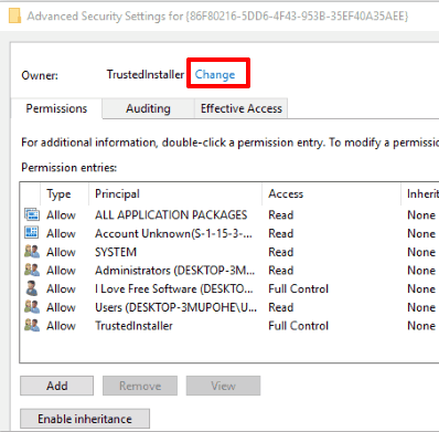 Step 6: Advanced Security Settings window will open. Here you will see that current owner for that registry key is set to TrustedInstaller. You need to change it with your PC name. For that, click “Change” option.
