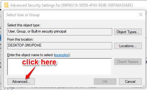 Step 7: A small window (Select User or Group) will open. That window contains “Advanced” button. Click on it.