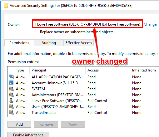 Step 9: Now you will come back to small window again. Select OK button in that window and then you will come back to Advanced Security Settings window. You will see that owner of that registry key is set as your PC. Apply and save this change.
