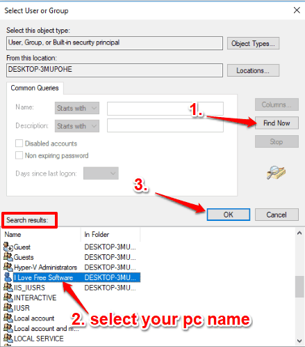 Step 8: One more window related to User or Group will open. Here, first click Find Now button and then select your PC name in search results. When PC name is selected, press OK.