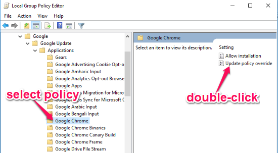 After that, click on Google Chrome and you will see two different settings named, “Allow installation” and “Update policy override” on the right panel. Now, double-click on the “Update policy override” to proceed.