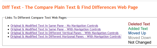 Getting started at Diff Text is very simple with no requirement for registering an account. On the homepage, you will be provided with the set of four links.