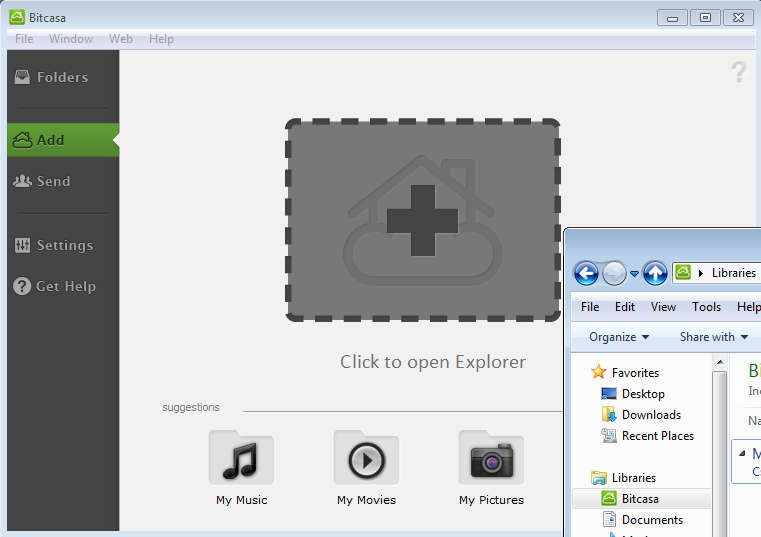 To add files, everything that you need to do is drag and drop folder which you want uploaded to the center screen and the transfer will begin. Similarly to what Dropbox does, Bitcasa will also create a folder in your libraries folder where you can seamlessly access data stored in your Bitcasa account as if you were accessing a local folder. On the bottom your can also see that there are suggestions of creating Bitcasa versions of folders like My Music, Movies, Pictures, Documents and so on, which is a smart thing to do if you would like to categorize your data a bit better.