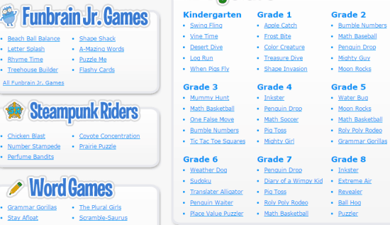 FunBrain is the website which has games for kids which help them improve their brain power in different areas. Here, you will find games like Number Games, Math Arcade, Reading, Word Games, Funbrain Jr.Games, Matching, Puzzles, etc.. You can also look for games on the basis of the grades (up to grade 8). You can choose the game on the basis of the skill you want your kid to learn or practice.