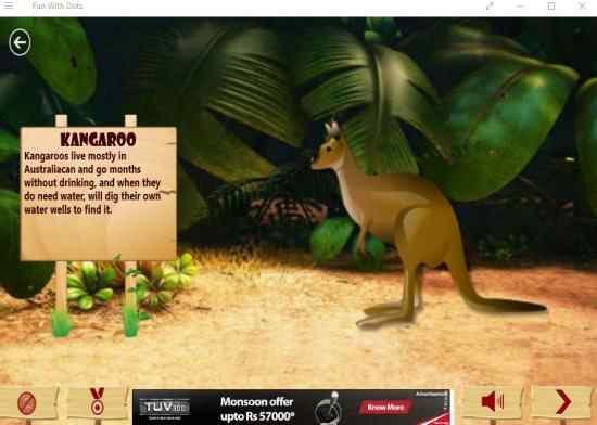Now you will be able to hear how the animal sounds and a few facts about the animal will be displayed on one side. You can listen to the animal sound again by clicking on the animal picture. The arrow button will take you to the next animal to join the dots. The button with the medal on it will show you your score for this level.