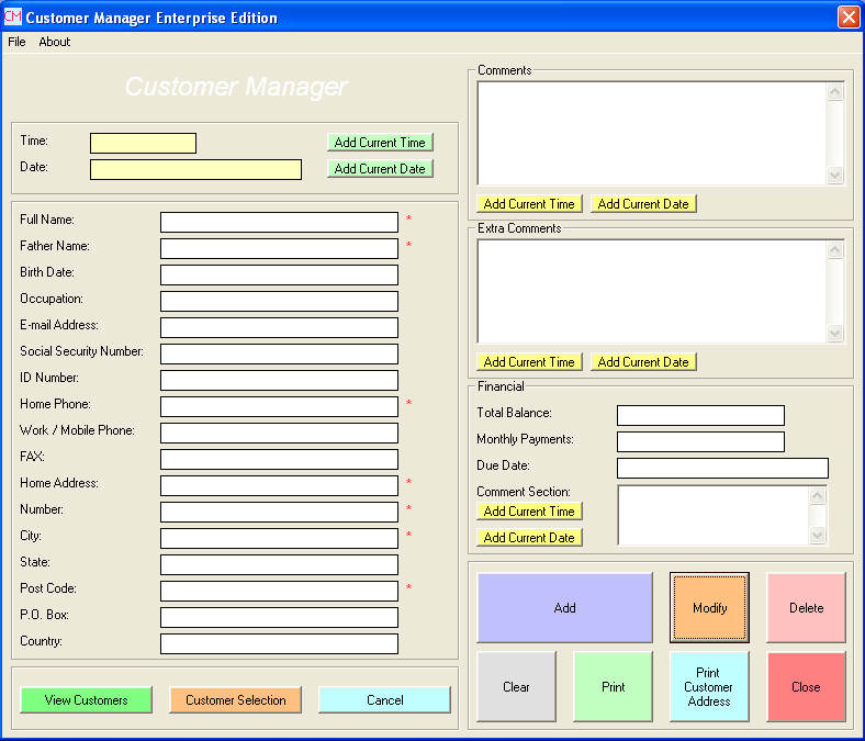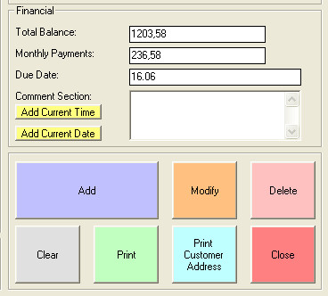 If you’re new to Customer Manager, the first thing that you need to do is enter in all the different contacts that you have, the customers with whom you’d like to keep in touch. Input fields that are important and which need to be entered are marked with red stars. Without them entered you’ll get errors when clicking Add. Another major advantage of using Customer Manager would be the fact that there is even a financial component of the application, true it’s small, but it can still be used in order to keep track of the basic debts that a particular client has towards your company or business.