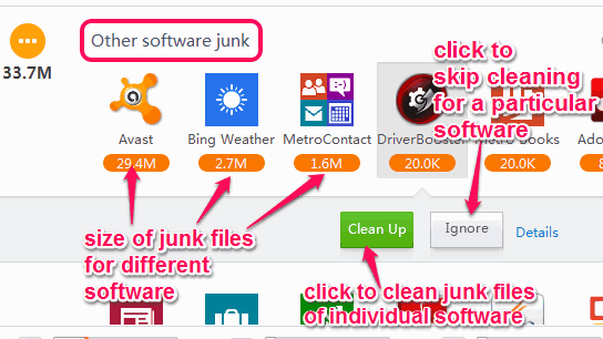 For each individual software, you can also view details to check log and cache files created by that particular software. You can also add any application/file to ignore list if you don’t want to clean cache or junk of that particular application. And to clean junk files only for a particular application, simply select that application, and use Clean Up button.