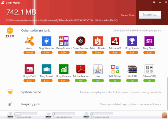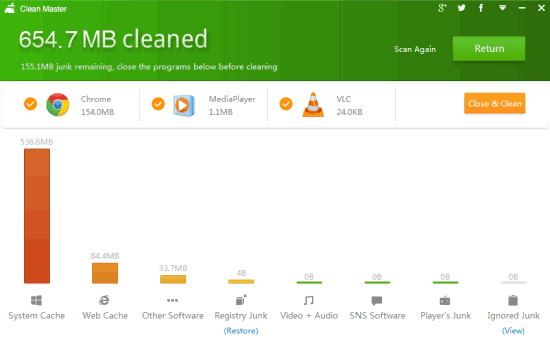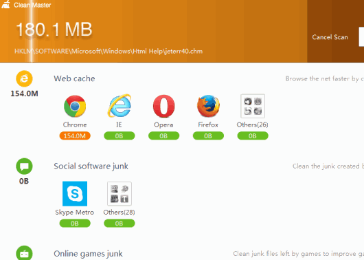 Clean Master for PC is a free system cleaner software that helps to remove junk files from PC. It lets you clean cache files of browsers, clean junk files of the registry, junk files of software, online games junk, and junk of audio video files. It automatically starts scanning of your PC to find out total junk files present in different sections.